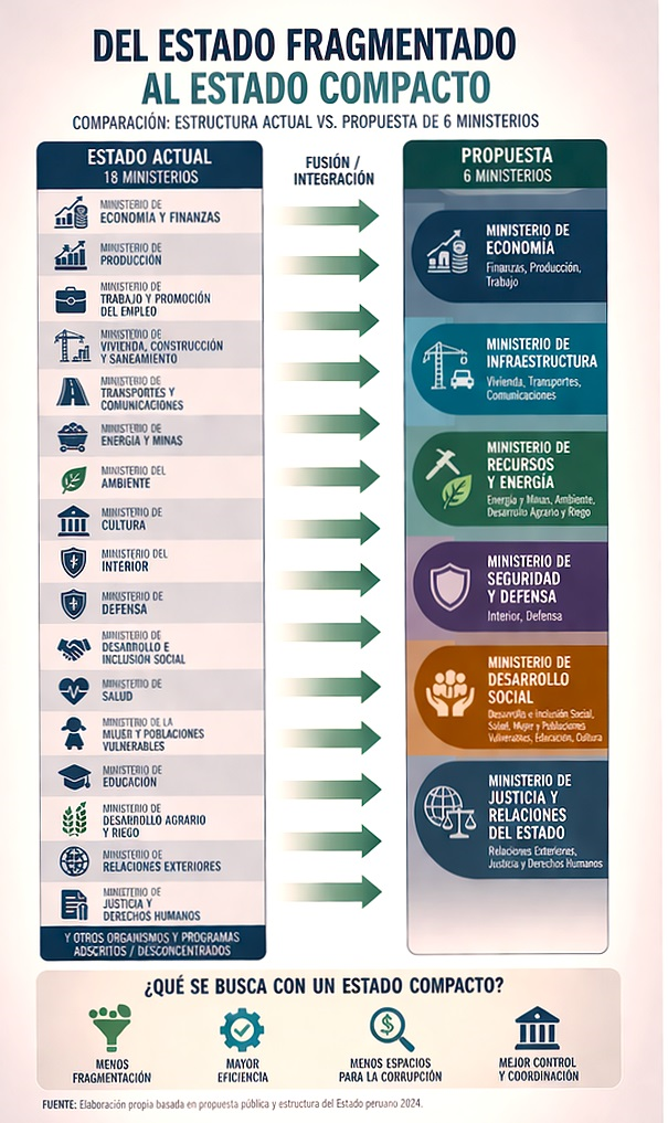 En el Perú, el tamaño del Estado ha dejado de ser solo un tema técnico para convertirse en una discusión casi existencial. Durante décadas, cada gobierno ha sumado capas a una estructura que, lejos de simplificarse, se ha vuelto más compleja, más pesada y, en muchos casos, menos eficiente. Ministerios, programas, oficinas y organismos han ido creciendo no siempre por necesidad funcional, sino muchas veces como respuesta a coyunturas políticas, presiones sectoriales o, en el peor de los casos, como espacios de reparto de poder.