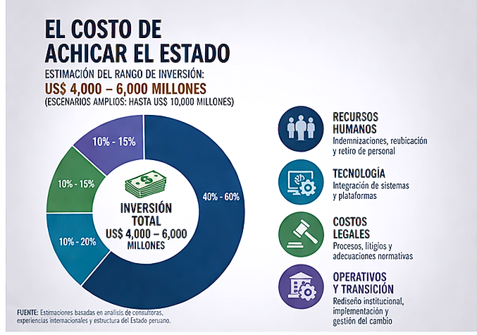 Las estimaciones más razonables sitúan la factura de una reforma de esta magnitud entre los US$4,000 y 6,000 millones, con escenarios que podrían escalar incluso hasta los US$10,000 millones. Es un gasto que no se traduce en obras visibles, pero sí en una transformación interna profunda: indemnizaciones, reorganización laboral, integración tecnológica, rediseño institucional y procesos legales inevitables.