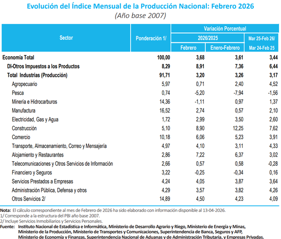 En términos generales, el INEI informó que la economía peruana mantuvo su desempeño positivo en febrero último, completando un primer bimestre con resultados alentadores. De acuerdo con la entidad, en el primer bimestre de 2026 la producción nacional se expandió 3.61% frente a similar periodo de 2025, mientras que en el periodo marzo 2025 – febrero 2026 la economía registró un incremento anualizado de 3.44% respecto a igual lapso del año anterior.